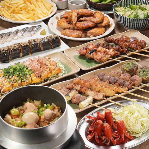 わいわいコースは全10品に加え、120分の飲み放題が含まれたお得なプラン。工場から毎日直送される新鮮チルド肉を使用した炭火焼き鳥を中心に、野菜巻き串やご飯ものも充実しています。2名から6名まで対応可能で、家族や友人との集まりにぴったり!昭和レトロな雰囲気の中で心温まる食事を楽しめます☆