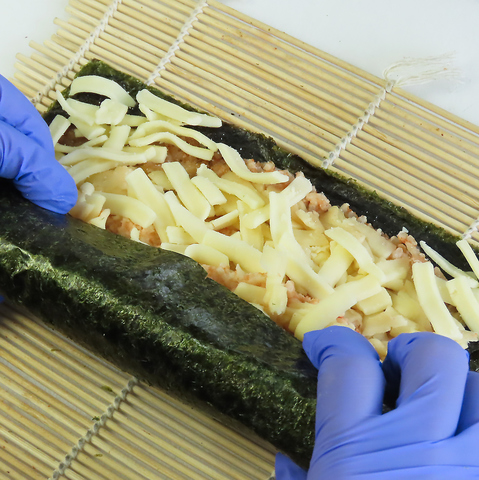 食材を扱う工程では、衛生面に配慮しながら一つひとつ形を整え、均一な仕上がりになるよう丁寧に準備を進めています。具材の配置や巻き加減まで確認しながら仕込むことで、提供時の美味しさにつながる品質を保っています。