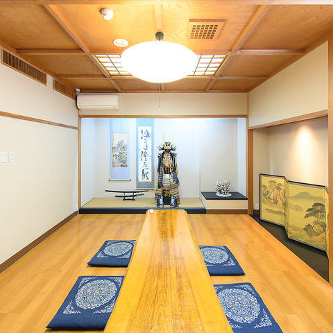 鎧が飾られた特別感のある10名様個室は、落ち着いた座敷空間でゆったりと過ごせるのが魅力。周囲を気にせず会話を楽しめるため、接待や顔合わせ、大切な日の食事にも最適。非日常を感じられる空間演出で、普段とはひと味違う特別な時間を演出してくれる一室です。