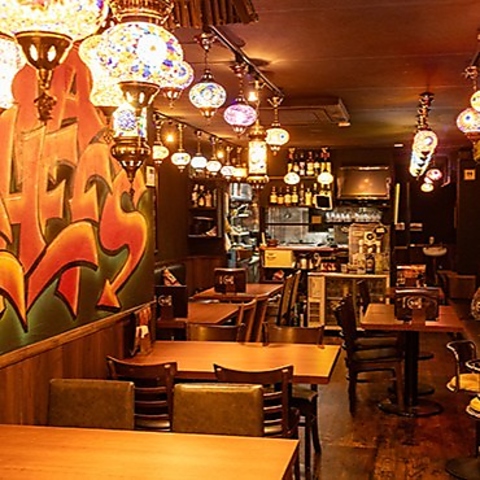 幻想的なアラビアンランプや鮮やかなグラフィックが目を引く空間。まるで海外にいるような雰囲気でお仕事の疲れも癒されます。店内の中心にはプロジェクターも設置し、パブリックビューイングも楽しめます♪