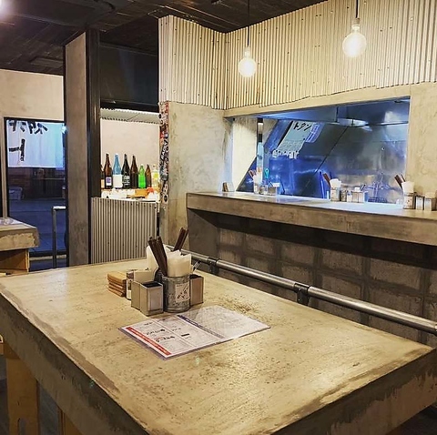 【立ち飲みカウンター席】無機質なコンクリートと温かな照明が調和する立ち飲みカウンター。ライブ感溢れる空間で、サクッと一杯楽しむのに最適です。