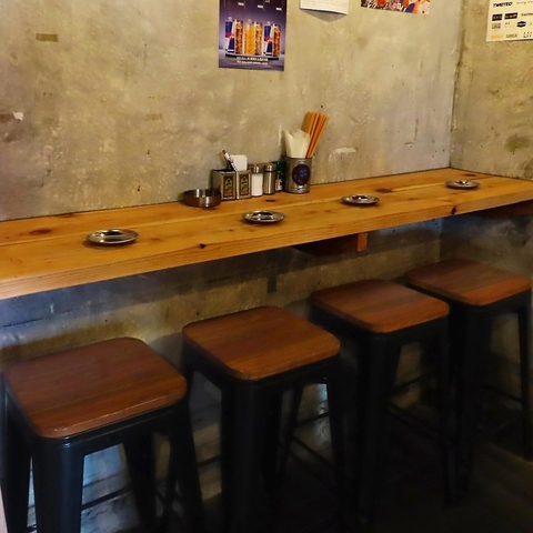 【カウンター席/椅子あり】コンクリート壁に木のぬくもりが映える、シックなカウンター席。落ち着いた雰囲気で、一人飲みやデートに最適です。
