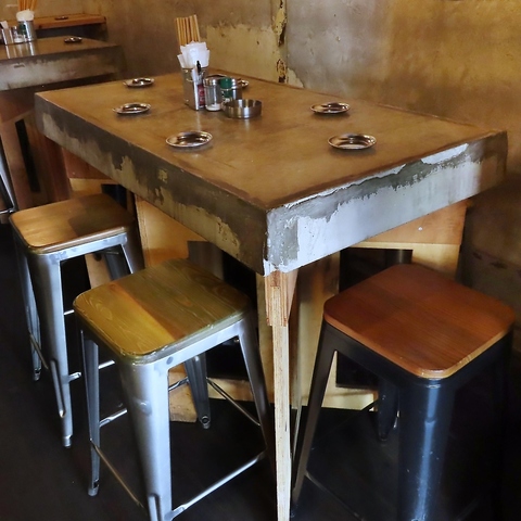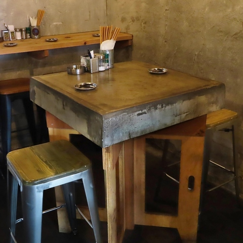 【2名様用・テーブル席】重厚感のあるコンクリートと木板が目を引く、2名掛けのテーブル席。隠れ家のようなインダストリアルな空間で、大切な人との会話も弾みます。