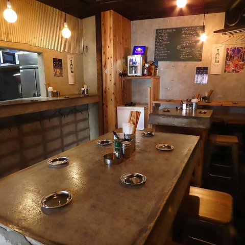 立ち飲みスタイルでありながら椅子も完備しており、お好みのスタイルでリラックスしてお過ごしいただけます。コンクリートの壁と木の温もりが調和したモダンな内装は、どなたでも気軽に立ち寄りやすい開放的な空間。お仕事帰りの一杯から、じっくり語り合いたい夜まで幅広く対応可能です◎