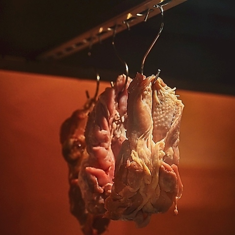 藁焼きの上で一夜干しされた鶏もも肉。水分が抜けて藁の香りが付いたお肉は旨味のピークに。注文後、炭火で香ばしく焼いて仕上げた逸品。