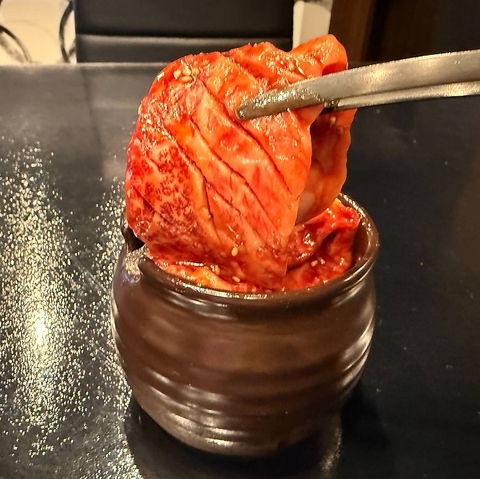 赤身の間に、まるで芸術品のように美しいきめ細かな霜降りが入り込んだ上質なお肉は、見た目からもその芳醇な旨味が伝わる至極の逸品です。一口食べれば、その味わいに驚くはずです。ぜひ自慢の焼肉をご堪能ください。