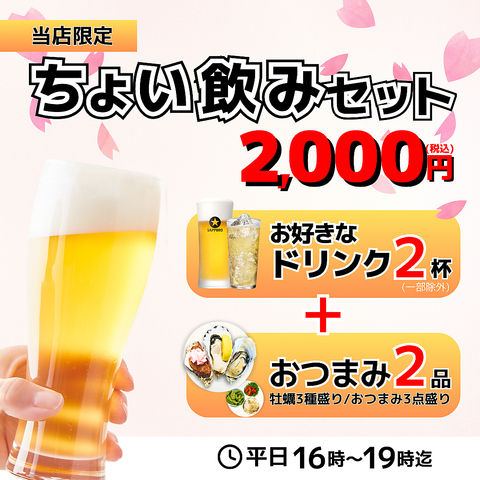 ビールを含むドリンク2杯とおつまみ2品で気軽にお得に楽しめる内容◎★手軽に楽しめる価格設定でありながら、ちょい飲みでも充実度を誇ります♪早い時間や隙間時間にもおすすめ◎