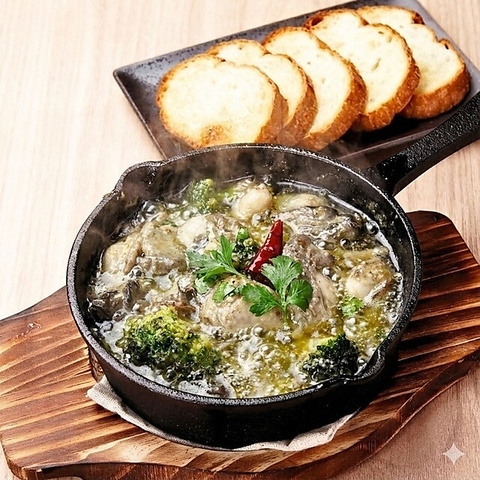 看板の食材をオリーブオイルとニンニクでじっくり煮込んだ、香り高い一皿です。エキスが溶け出したオイルにパンを浸せば、止まらない美味しさが広がります。ビールやワインとの相性も抜群で、お酒が進むこと間違いなし。お集まりの際や二軒目利用でも、温かいおつまみとして多くのお客様に選ばれている逸品です。