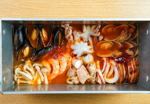 ※2~3人前(トッピング各種:チーズ、乾麺、うどん、トック、ミナリ)たこ、ホルモン、エビ、旨味のオールスターが勢ぞろいした釜山発祥の絶品ピリ辛鍋。
